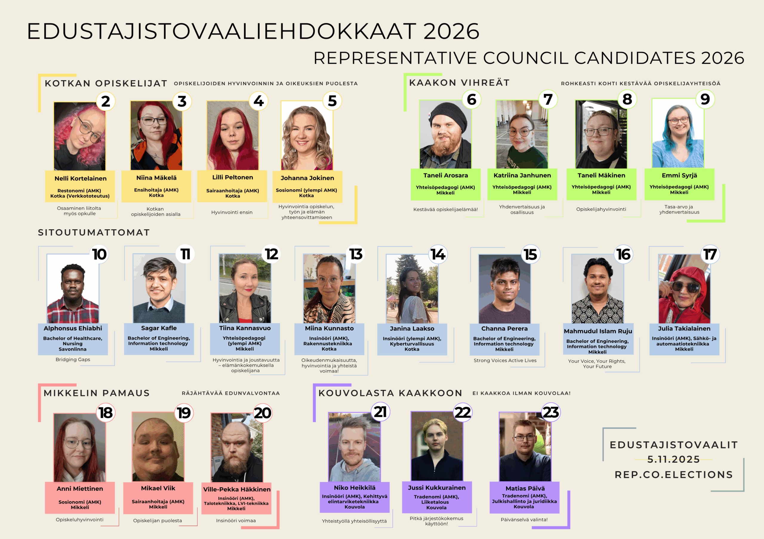 Vaaleissa on ehdolla 22 ehdokasta, joista vaaleilla valitaan 20 varsinaista jäsentä sekä varajäsenet opiskelijakunnan edustajistoon vuodelle 2026. Edustajisto käyttää opiskelijakunnan ylintä päätösvaltaa.