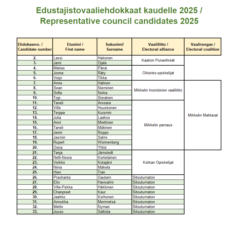 The candidate nomination period for the Student Union of Kaakko’s representative council elections has ended. The central election committee confirmed the candidates, electoral alliances, and formed electoral coalitions in its meeting on October 2nd.